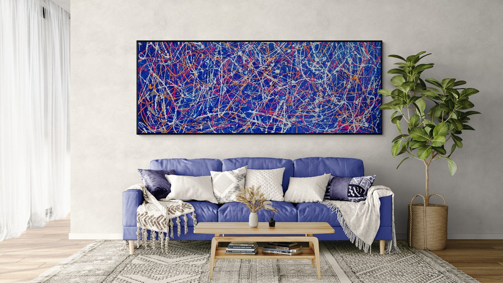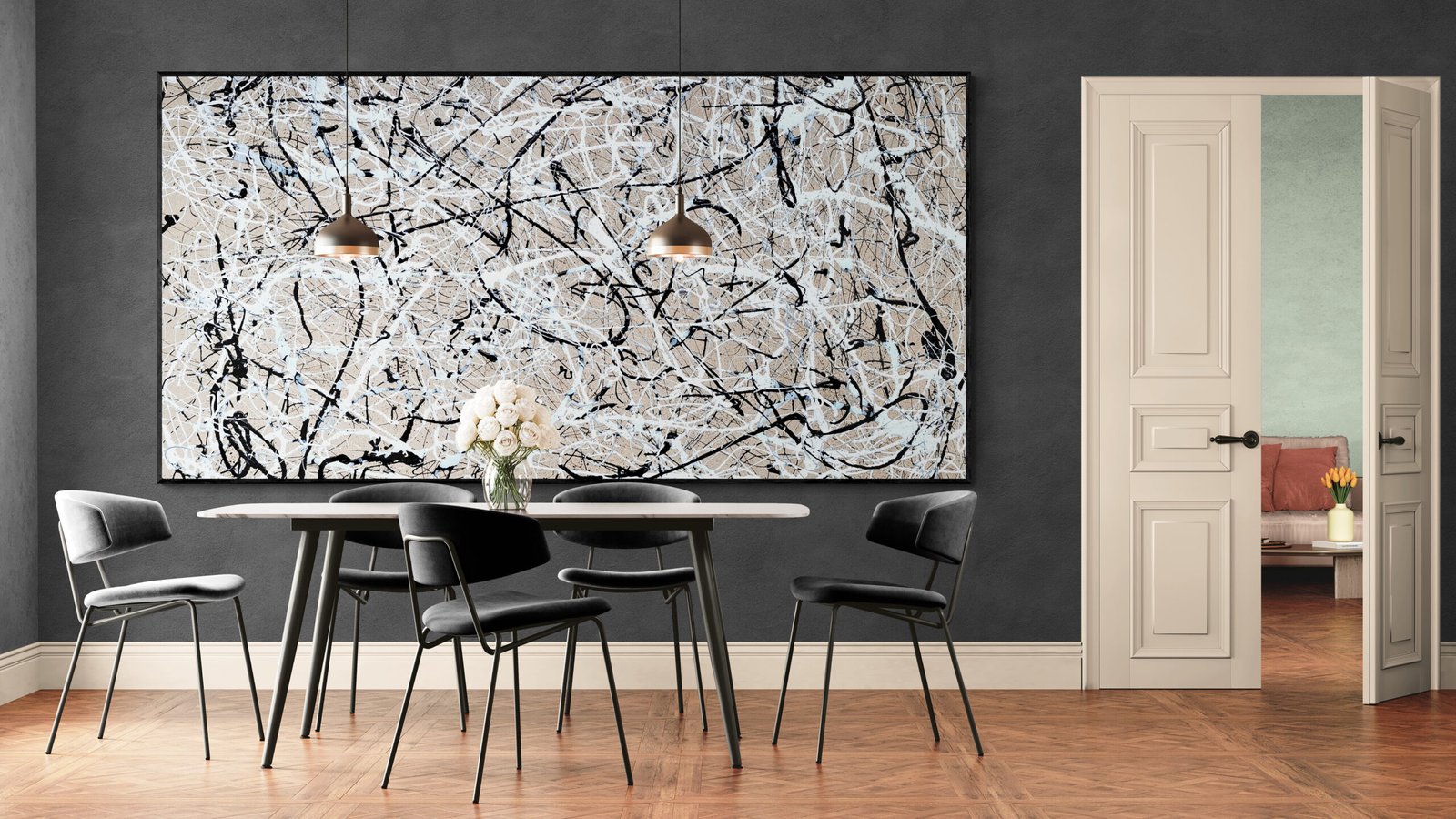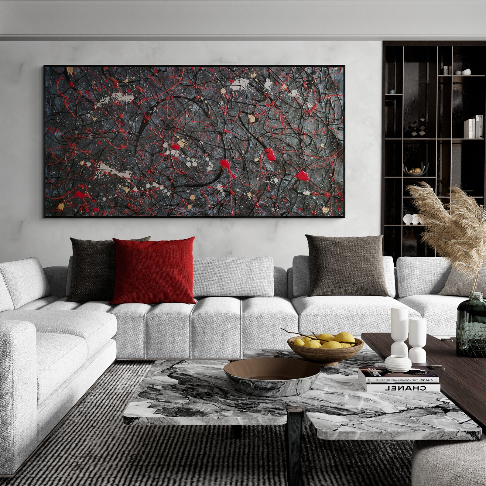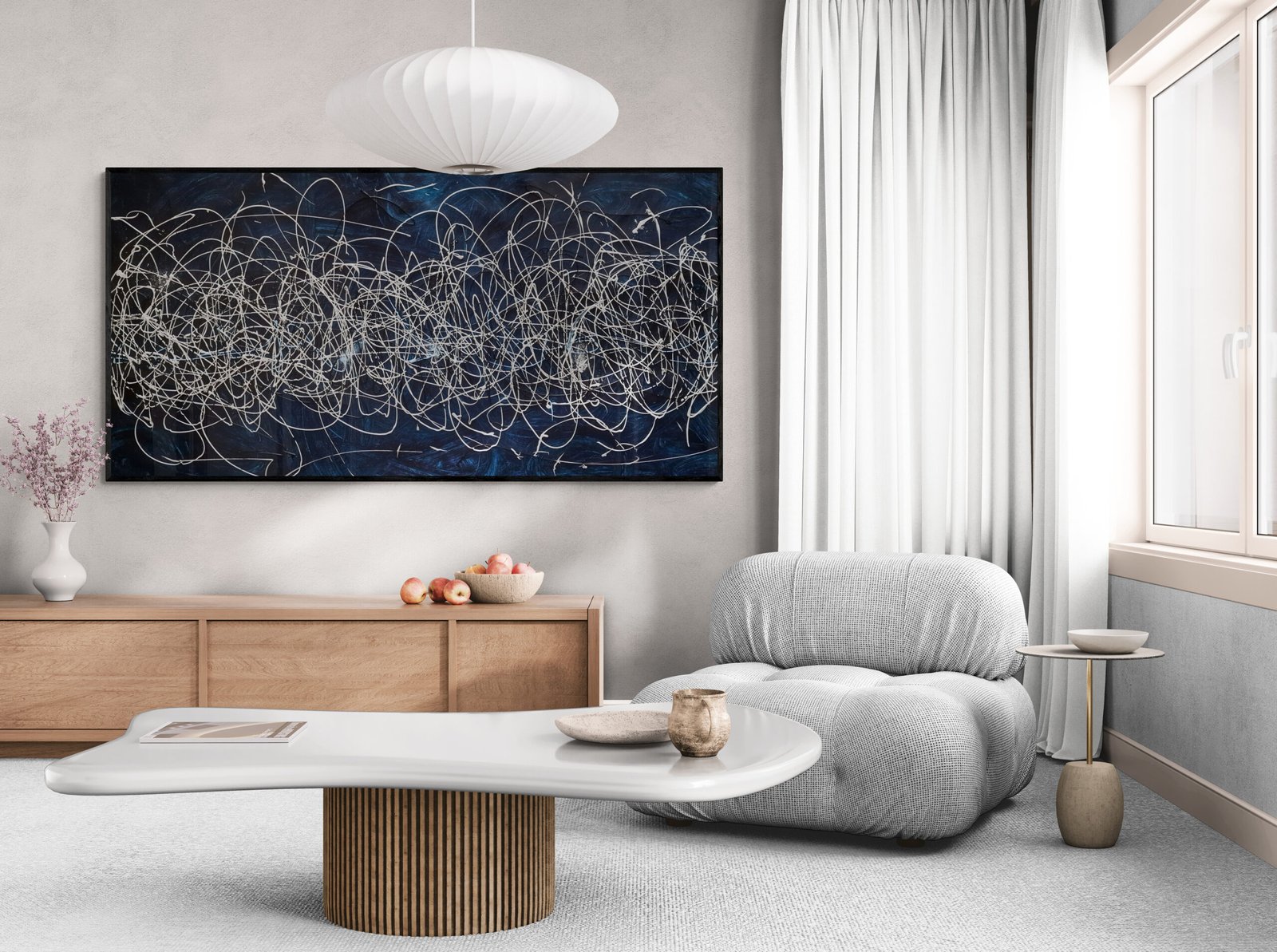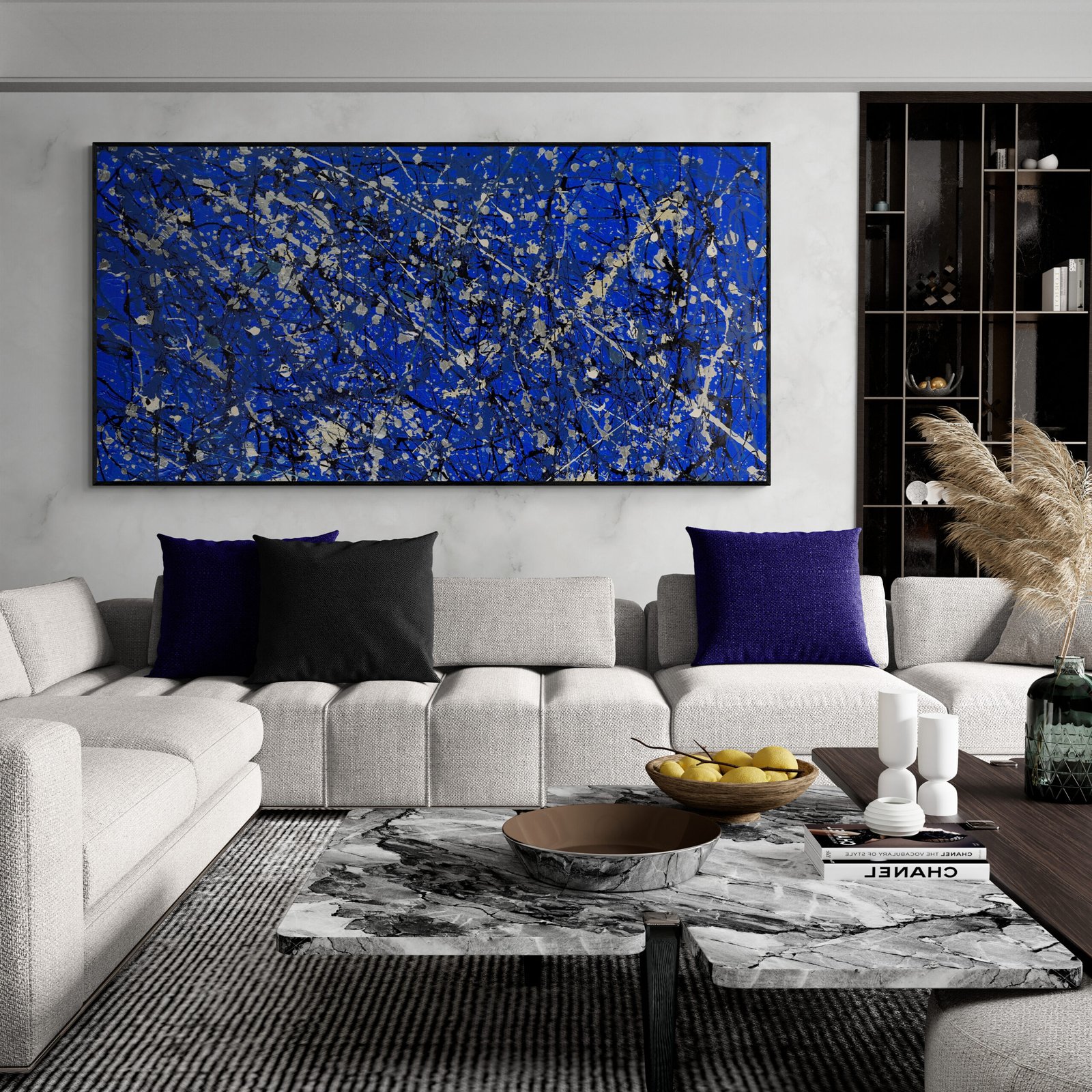 This selection shows different ways abstract art in interiors can be integrated into real spaces. Some examples focus on large statement pieces for wide walls. Others show how multiple artworks can work together as a visual system.