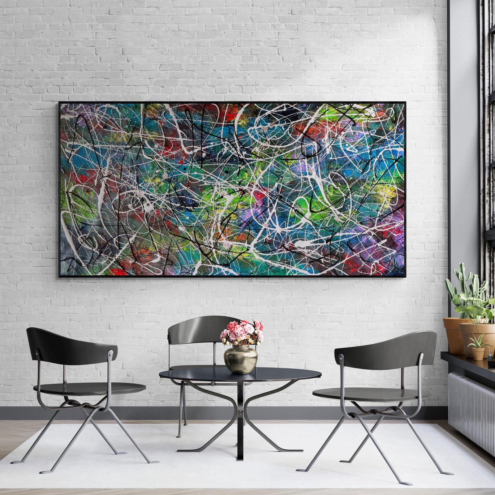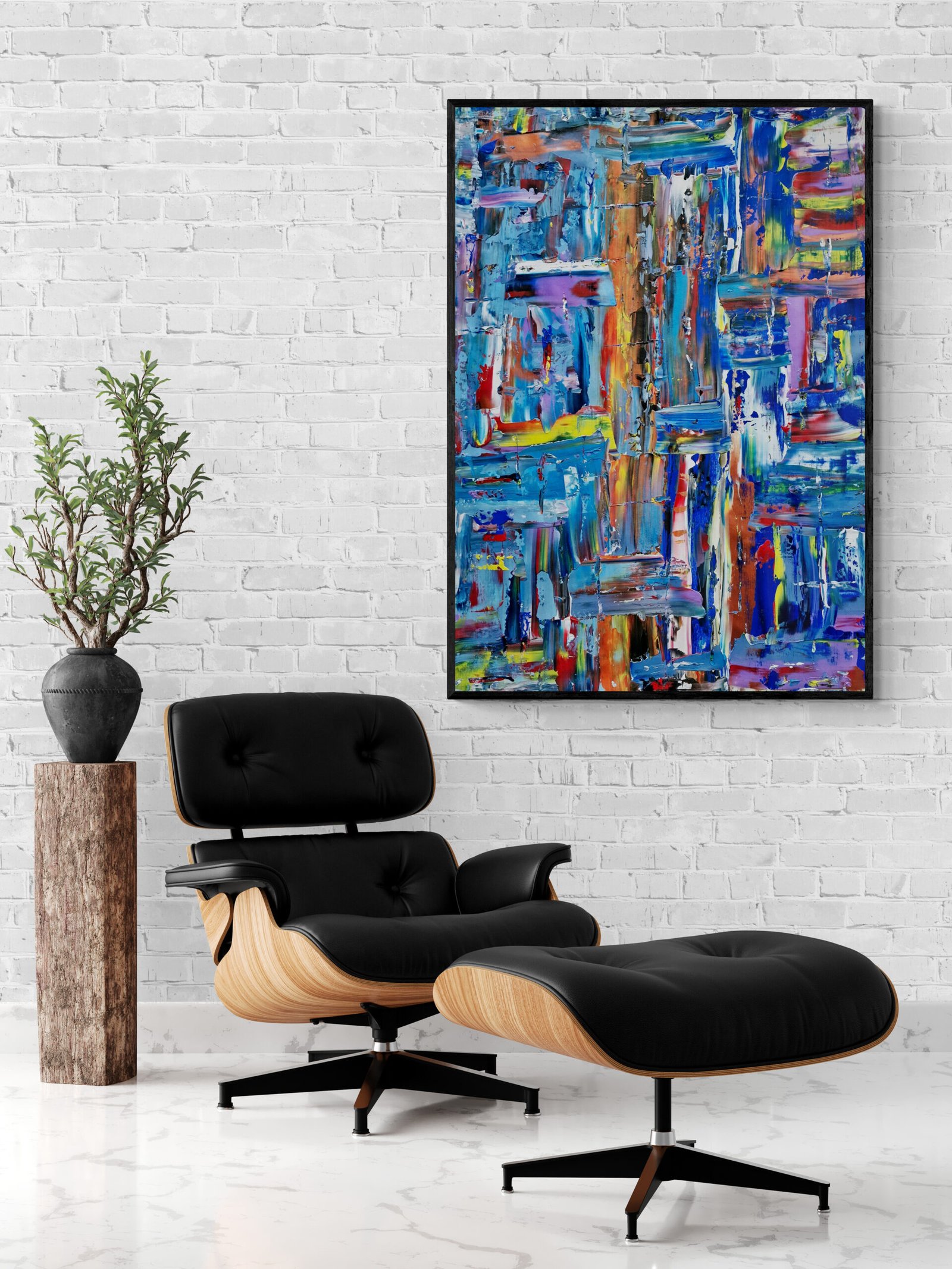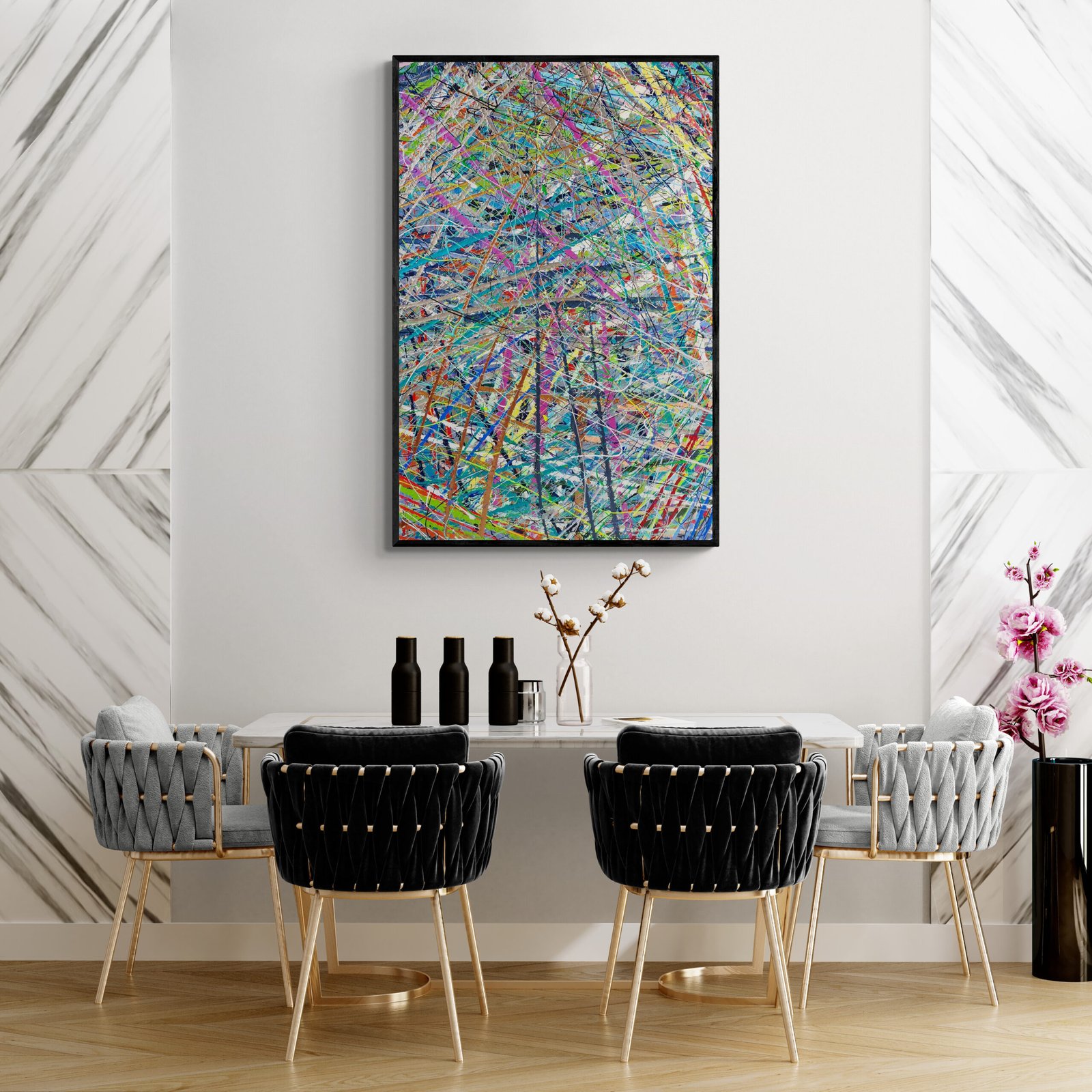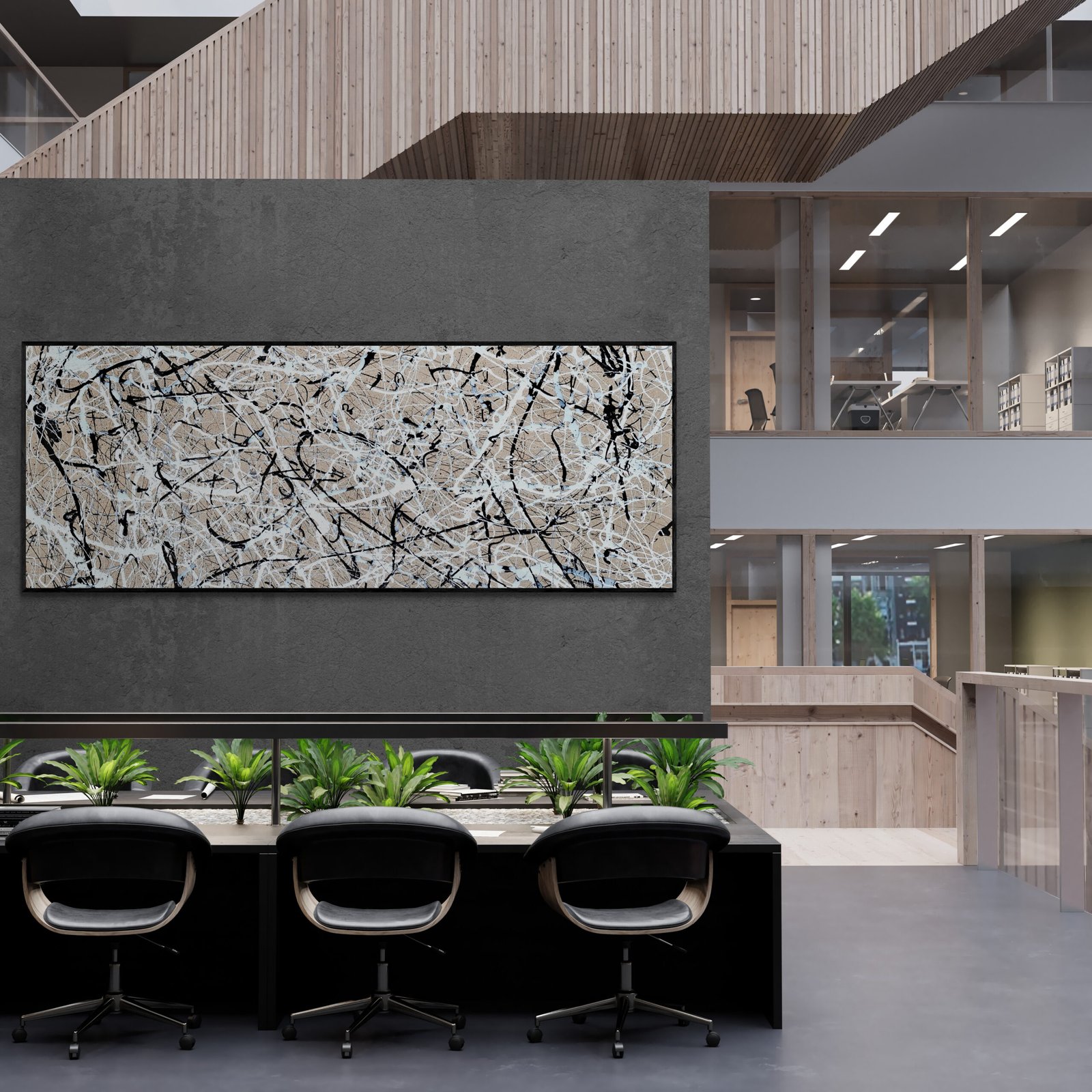 Abstract art is not just something you hang on a wall. It is something that defines a space, sets a mood and gives character to an interior. In this gallery you can see how abstract art in interiors comes to life in real environments: modern living rooms, offices, hotels and large architectural spaces.