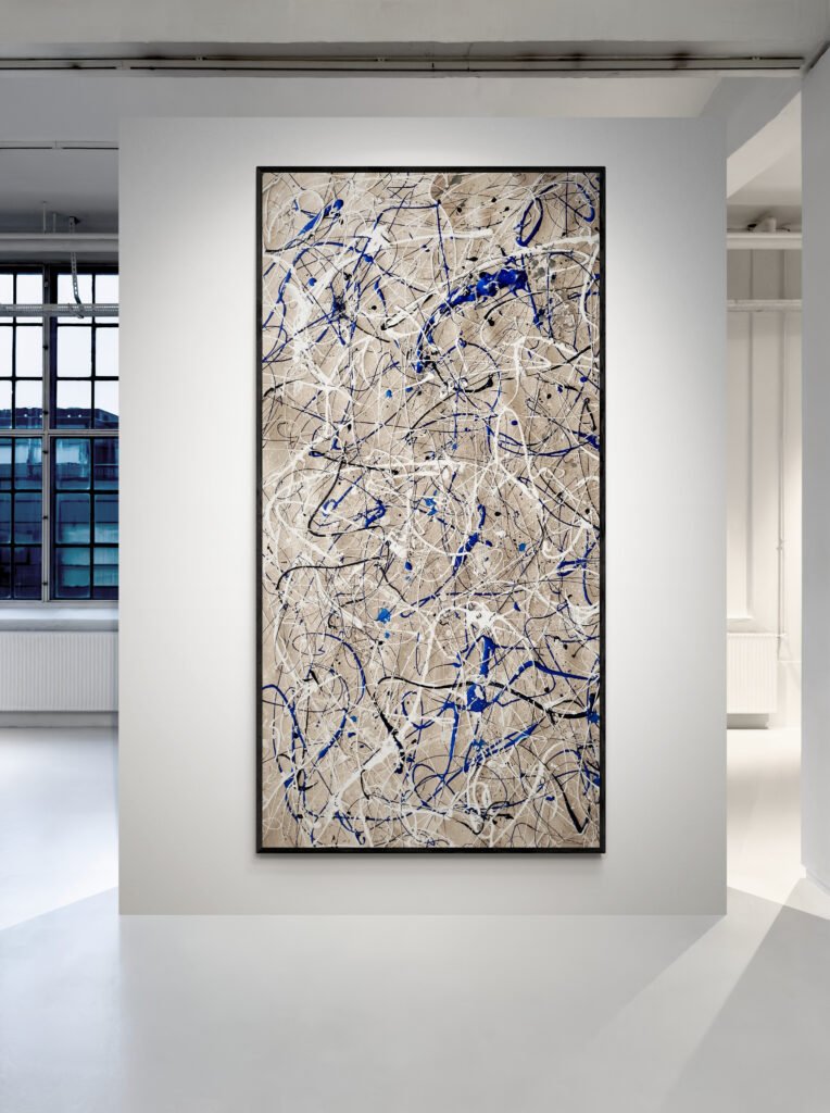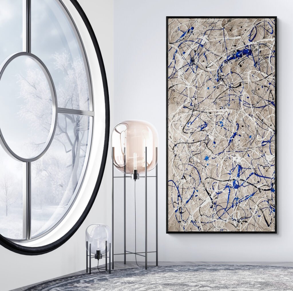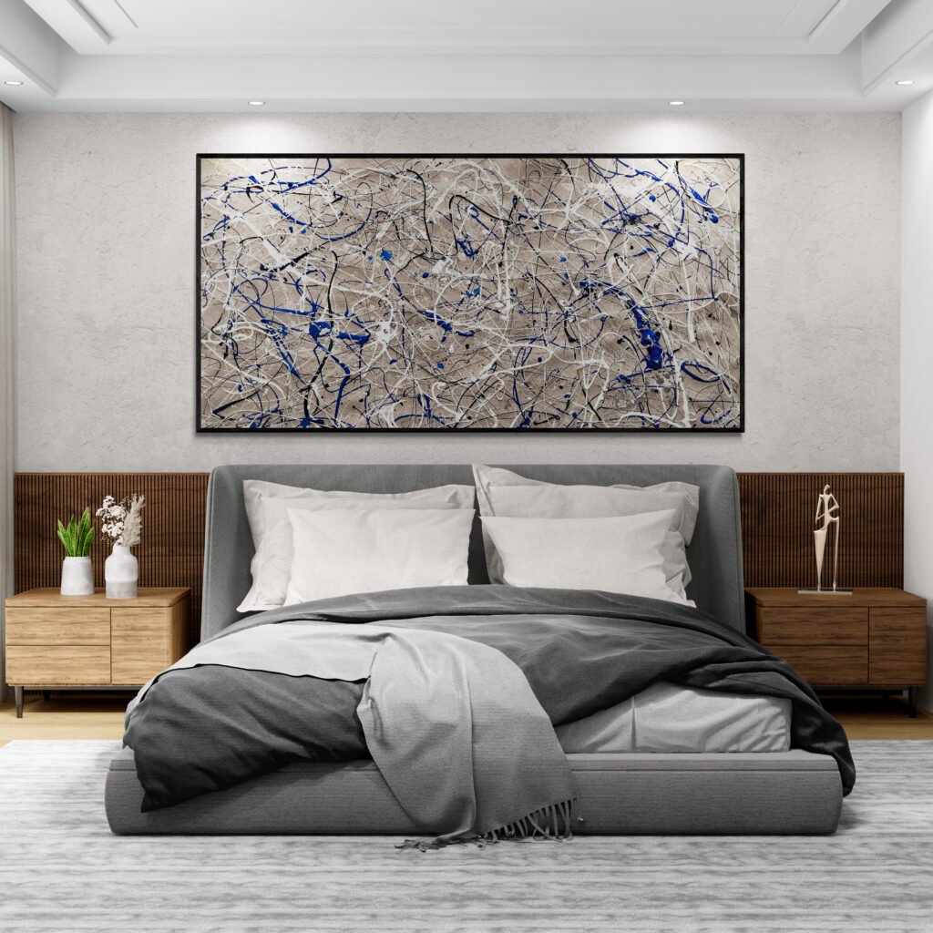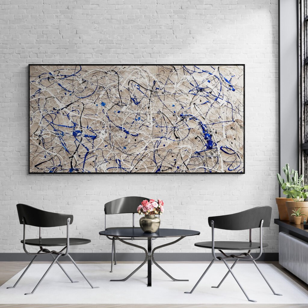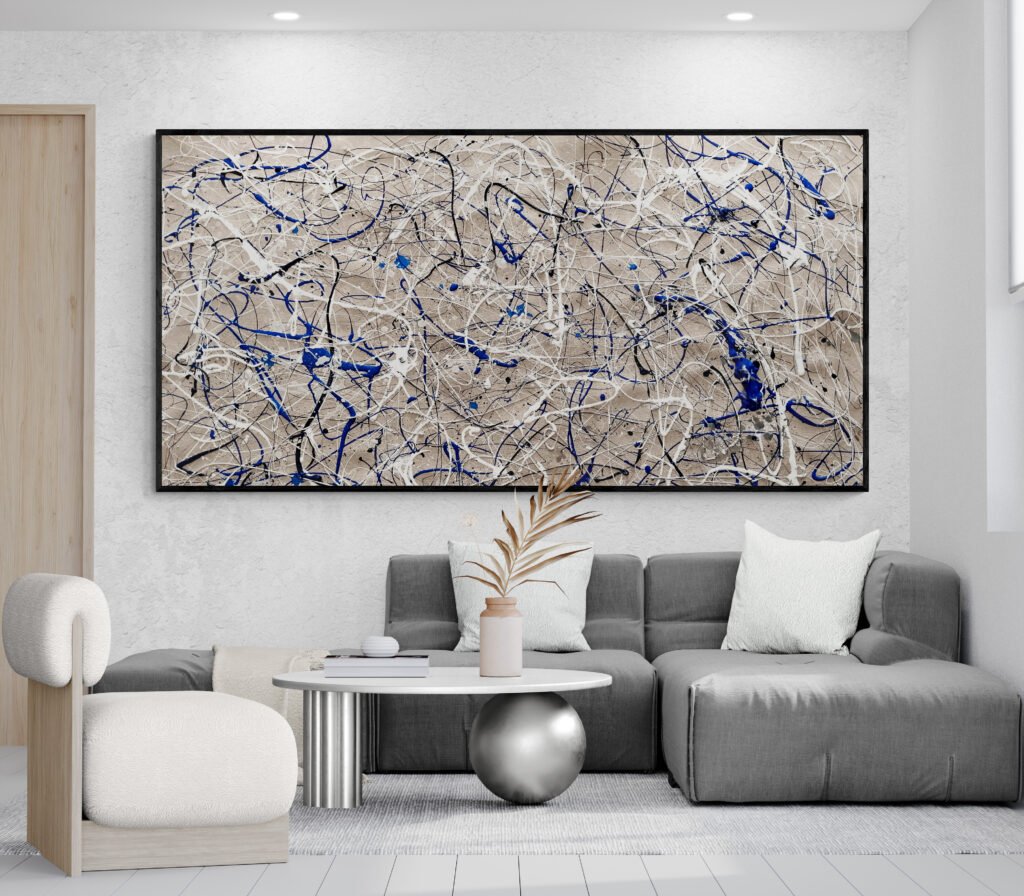 Immerse yourself in the serene harmony of Number 24, an XXL Jackson Pollock-style abstract canvas that reimagines drip painting with natural sophistication. Set against a soft beige background, expressive blue splashes and dynamic gestures create a balanced, flowing composition that radiates tranquility and depth.