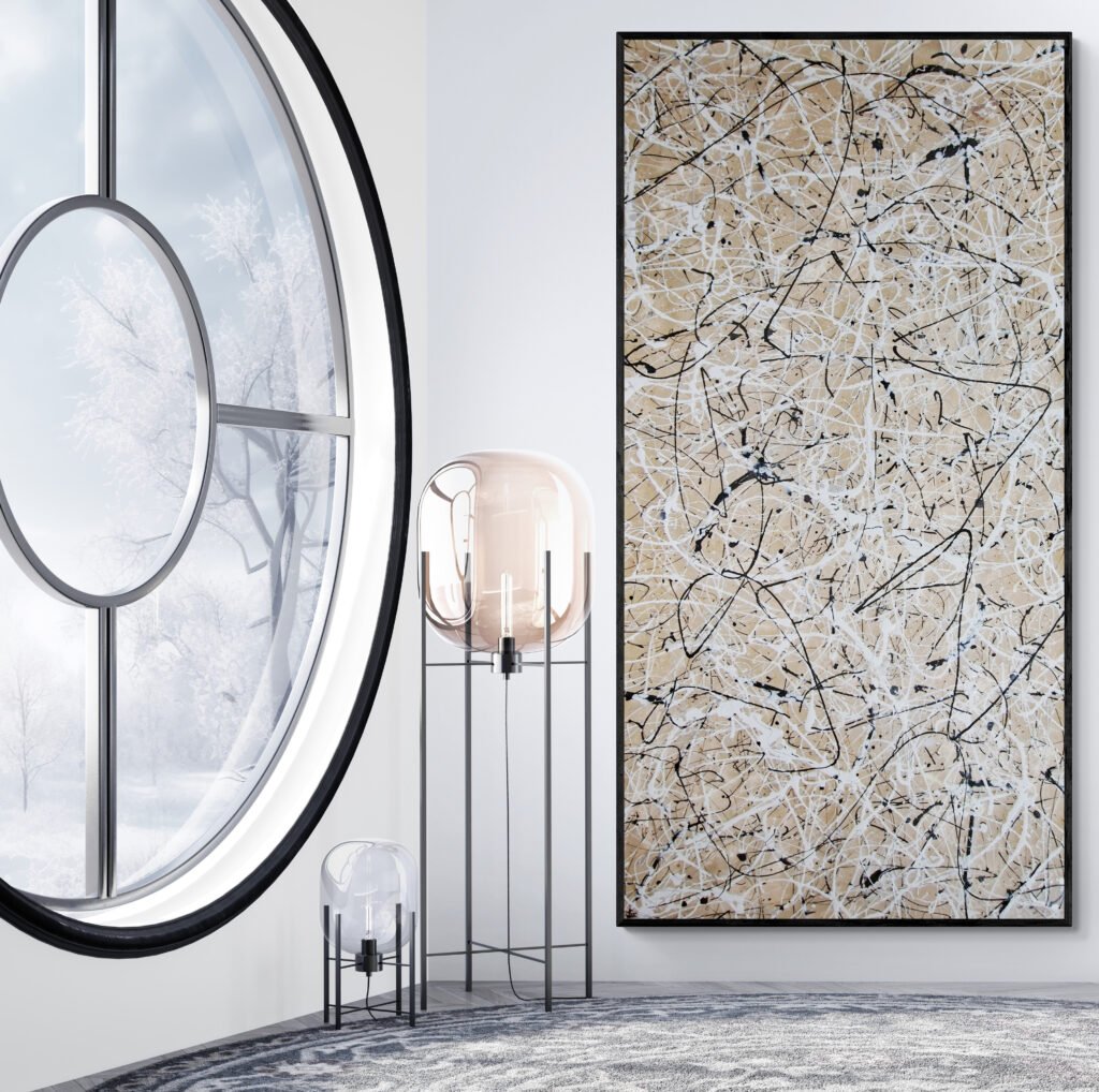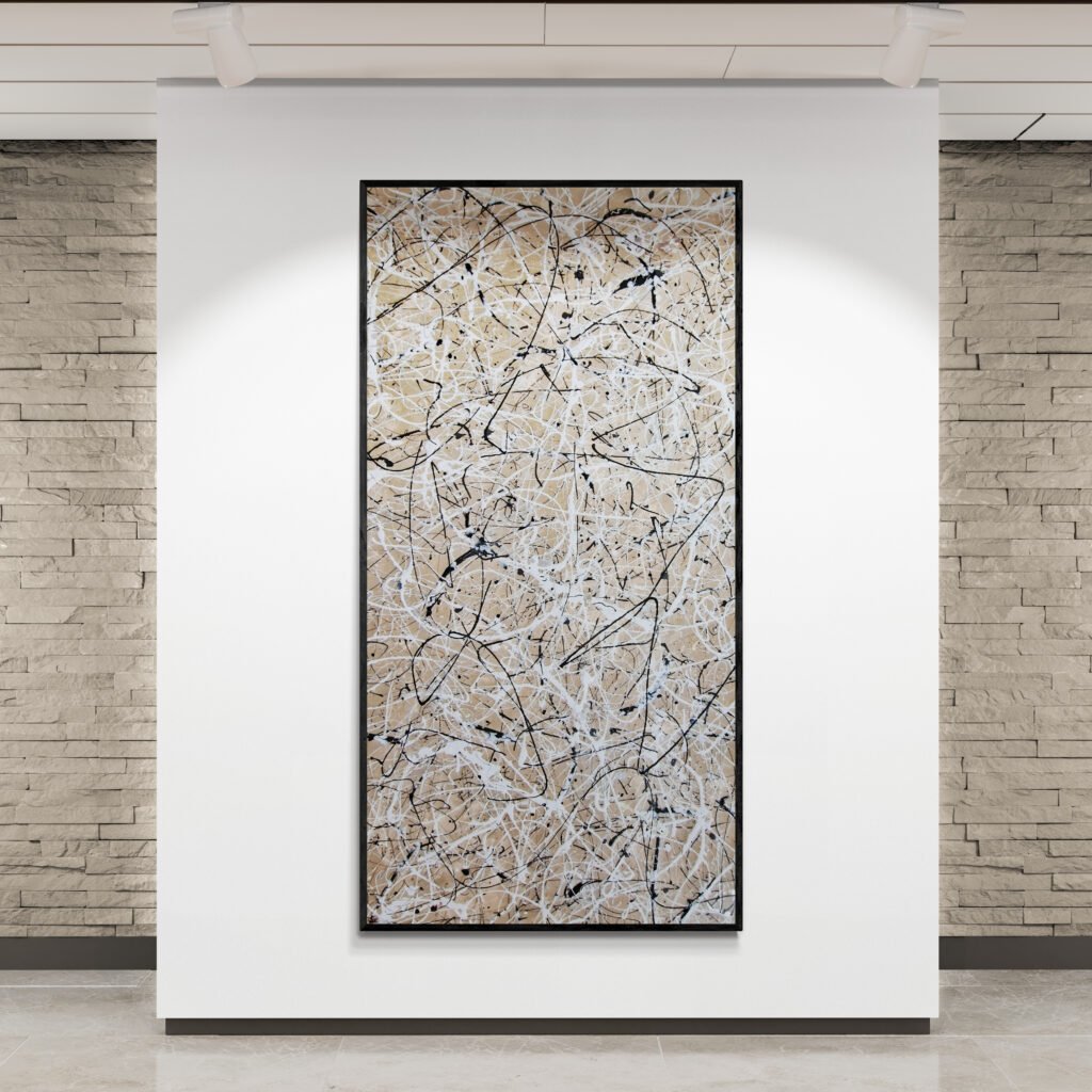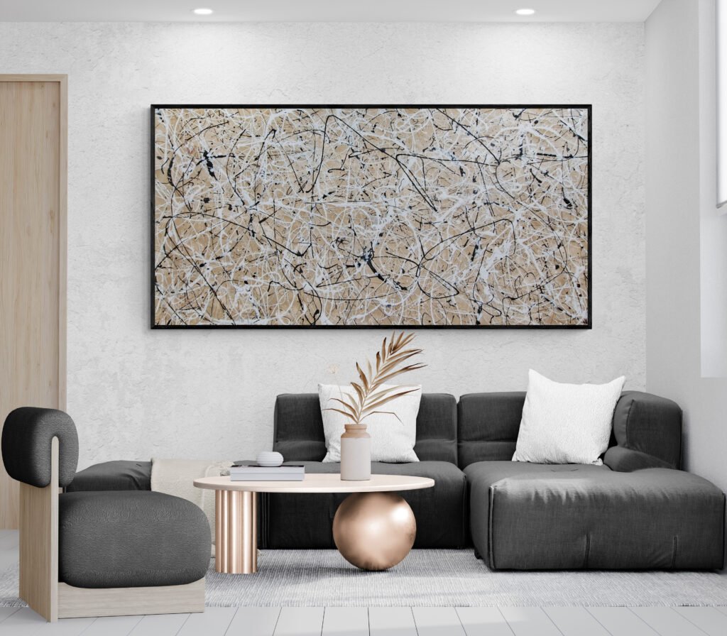 Entirely hand-painted, this Jackson Pollock style neutral masterpiece embodies harmony, texture, and subtle sophistication. It’s designed for interiors that seek visual calm, natural warmth, and timeless style without losing artistic personality. The neutral tones and structured gestures make it a statement of understated luxury — perfect for spaces that value serenity through design.