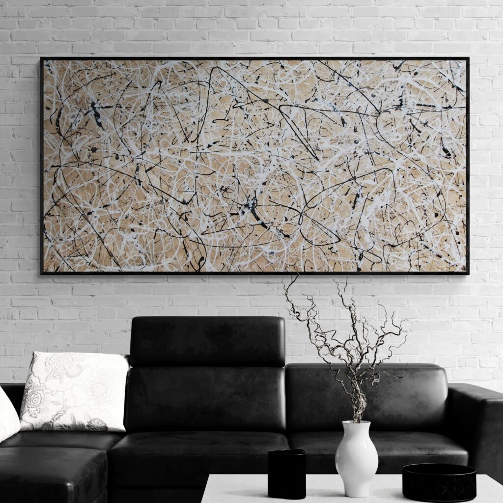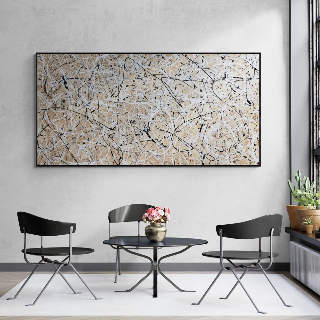 Let yourself be drawn into the serene beauty of Number 44, an XXL Jackson Pollock style neutral abstract canvas that reinterprets the iconic drip technique with refined minimalism and compositional grace. On a warm sand-colored background, balanced strokes in pure white, deep black, metallic silver, and champagne tones create a tranquil yet expressive visual dialogue.