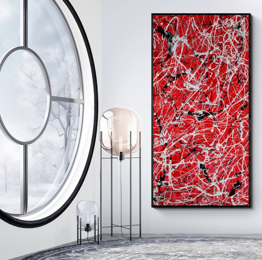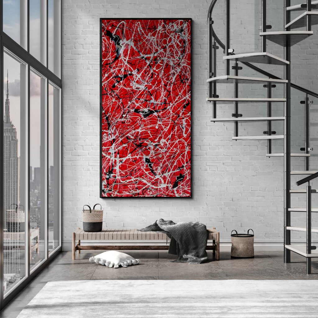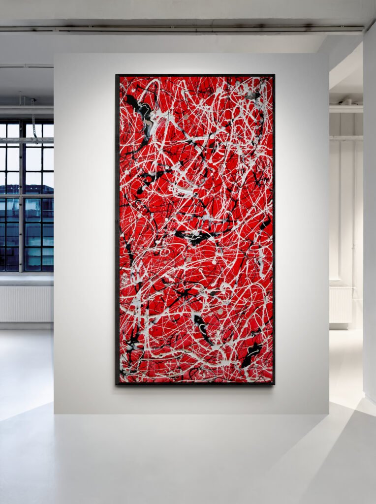 Be captivated by Number 86, an XXL Jackson Pollock style red, black and white abstract canvas that celebrates the timeless power of color and movement. Inspired by the bold essence of Coca-Cola’s iconic tones, this hand-painted masterpiece combines a deep red background with dynamic black gestures and crisp white splashes — a perfect fusion of intensity, rhythm, and modern balance.
