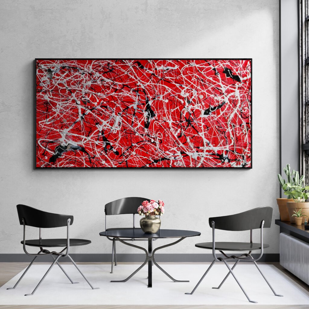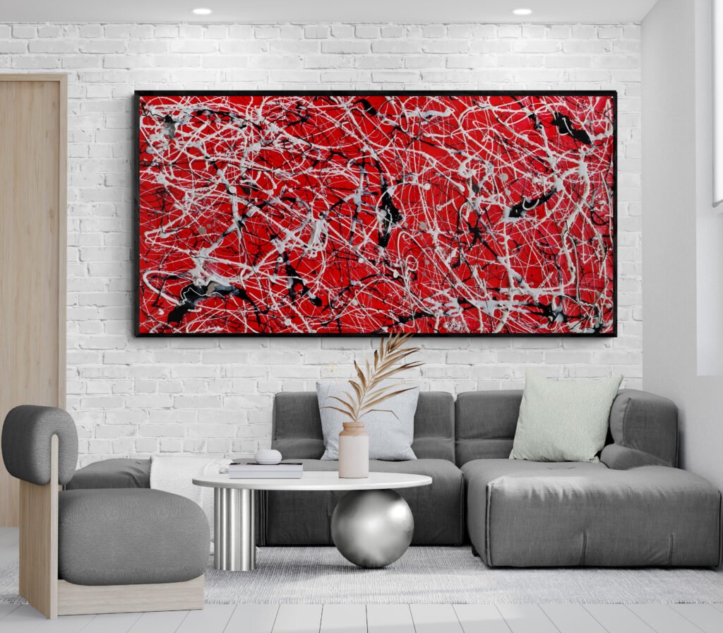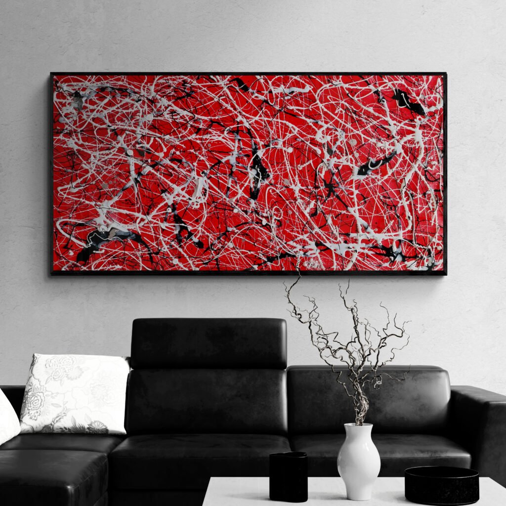 Discover this exclusive artwork at KooKAbstractArtwork on Etsy — a bold red, black, and white Pollock-inspired canvas designed to energize and elevate modern interiors
